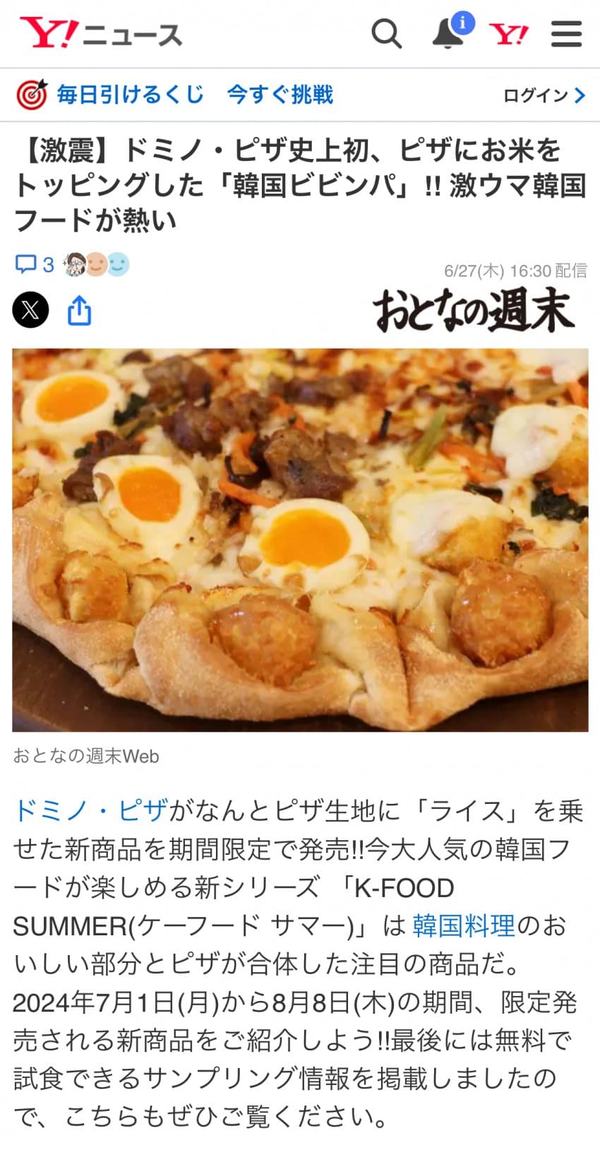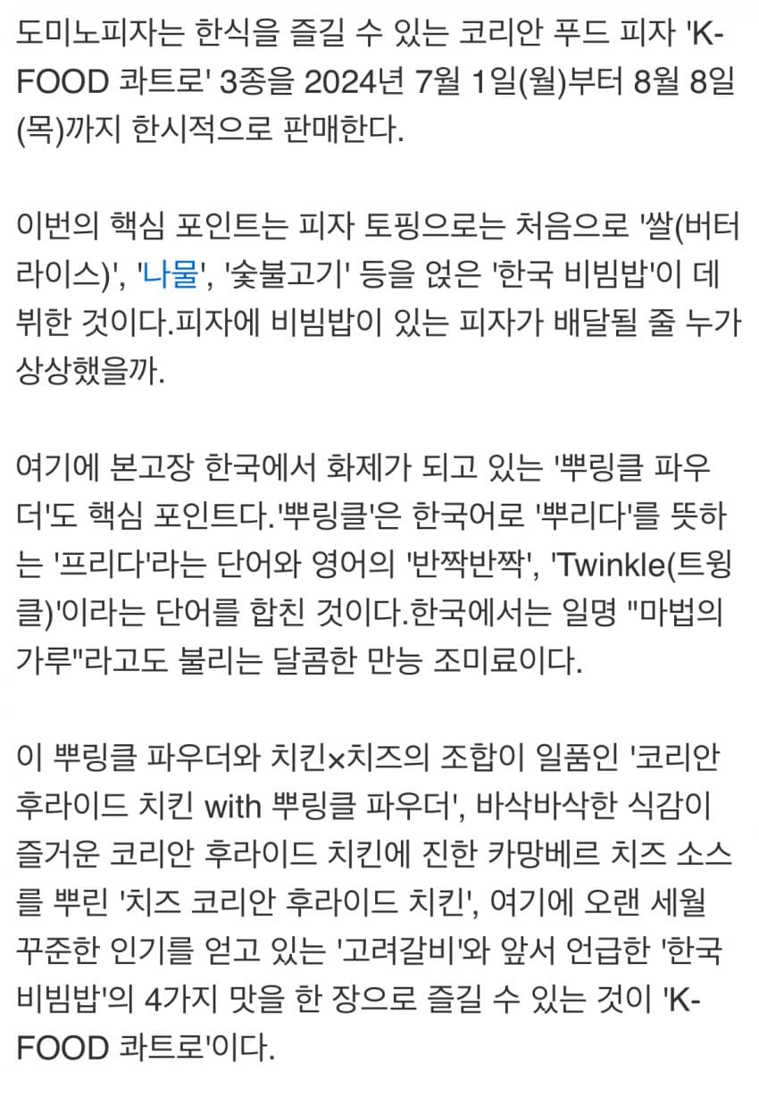 최근 일본 도미노피자가 새로운 메뉴를 출시했습니다. 바로 '한국 비빔밥 피자'인데요. 이번 신메뉴는 일본 도미노피자가 한국의 대표적인 전통 음식인 비빔밥에 도전하면서 피자의 새로운 가능성을 보여주고 있다고 합니다.