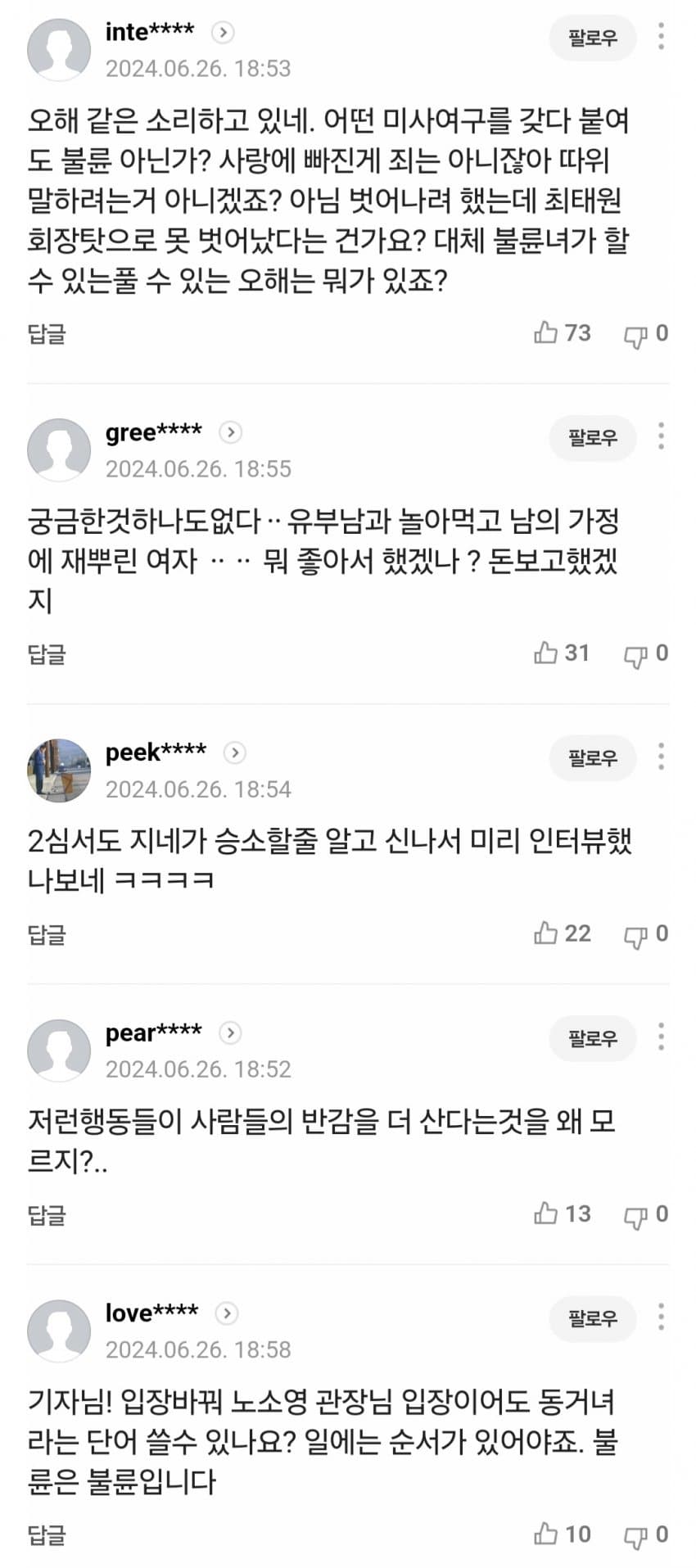 싸늘한 댓글 반응은 보통 불륜녀라는 비하