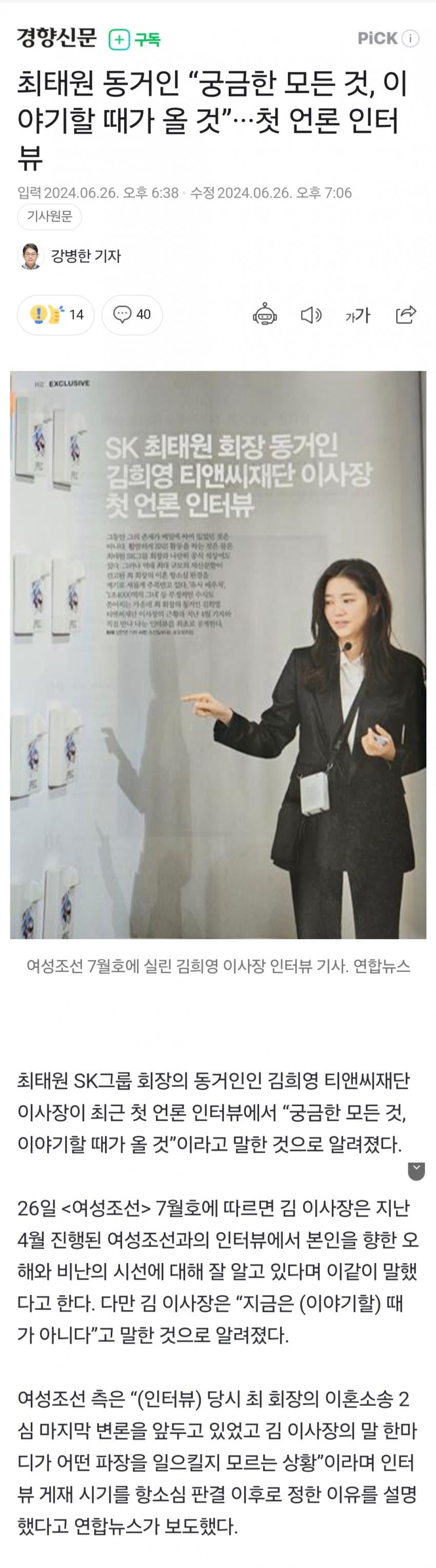 최태원 SK그룹 회장의 동거인인 김희영 티앤씨재단 이사장이 최근 언론 인터뷰에서 “궁금한 모든 것, 이야기할 때가 올 것”이라고 말한 것으로 알려졌다. 26일 <여성조선> 7월호에 따르면 김 이